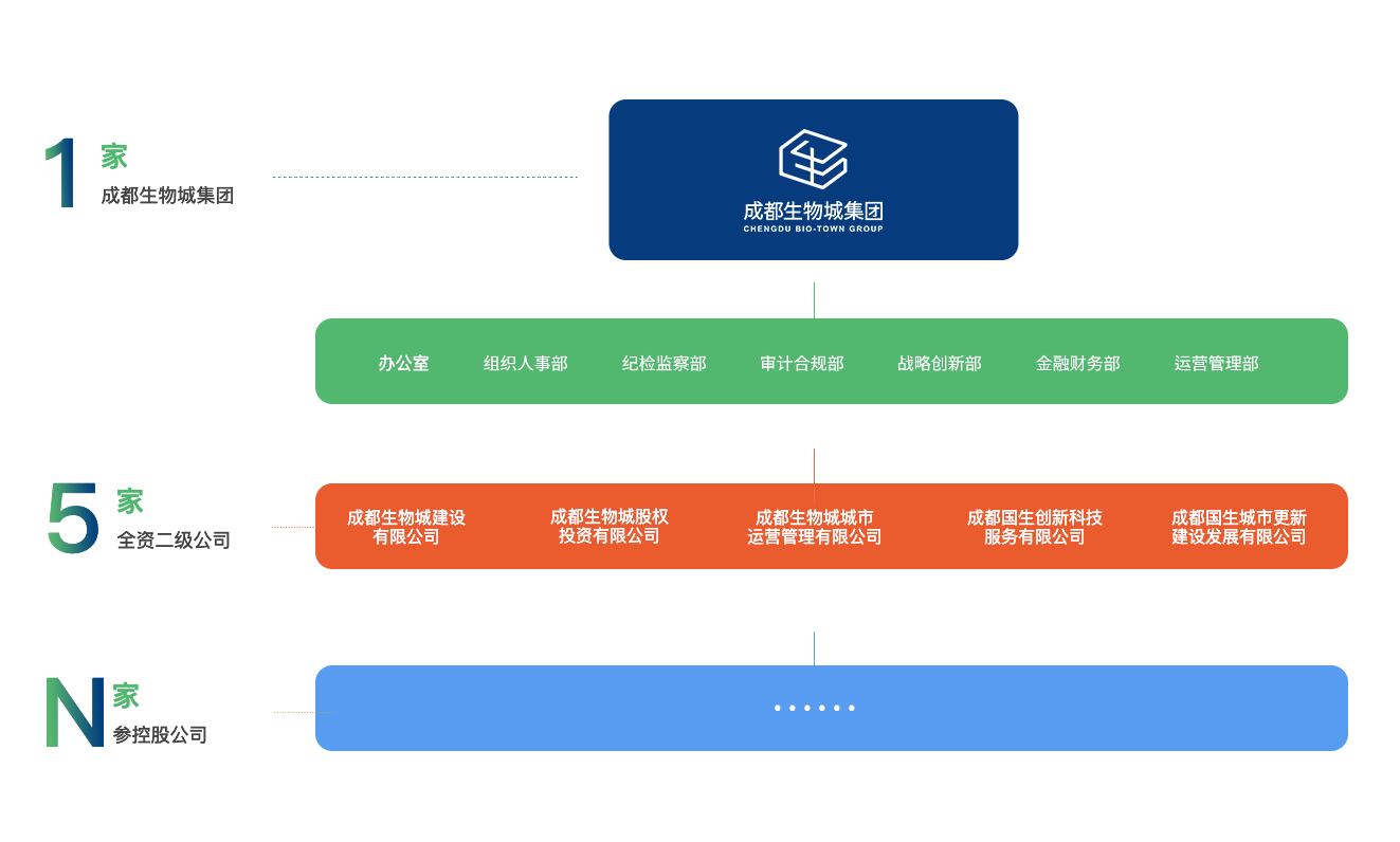 目前,集團按照“1+5+N”三級架構下設5個(gè)二級子公司,成都生物城建設有限公司、成都生物城股權投資有限公司、成都生物城城市運營(yíng)管理有限公司、成都國生創(chuàng )新科技服務(wù)有限公司、成都國生城市更新建設發(fā)展有限公司。在三級公司積極推進(jìn)國企混改,引入社會(huì )優(yōu)質(zhì)戰略投資者,與中石油、格力、國藥、華西等行業(yè)龍頭成立合資企業(yè)10家,參股成都威斯克生物醫藥有限公司、成都海楓生物科技有限公司、成都天府國際生物城供應鏈服務(wù)有限公司等企業(yè)。集團資產(chǎn)規模超300億元,已獲得AA+主體信用評級,通過(guò)ISO9001質(zhì)量管理體系認證、ISO14001環(huán)境管理體系認證、OHSAS18001健康安全管理體系認證,并獲得ISO37301:2021及GB/T35770-2022合規管理體系雙認證。