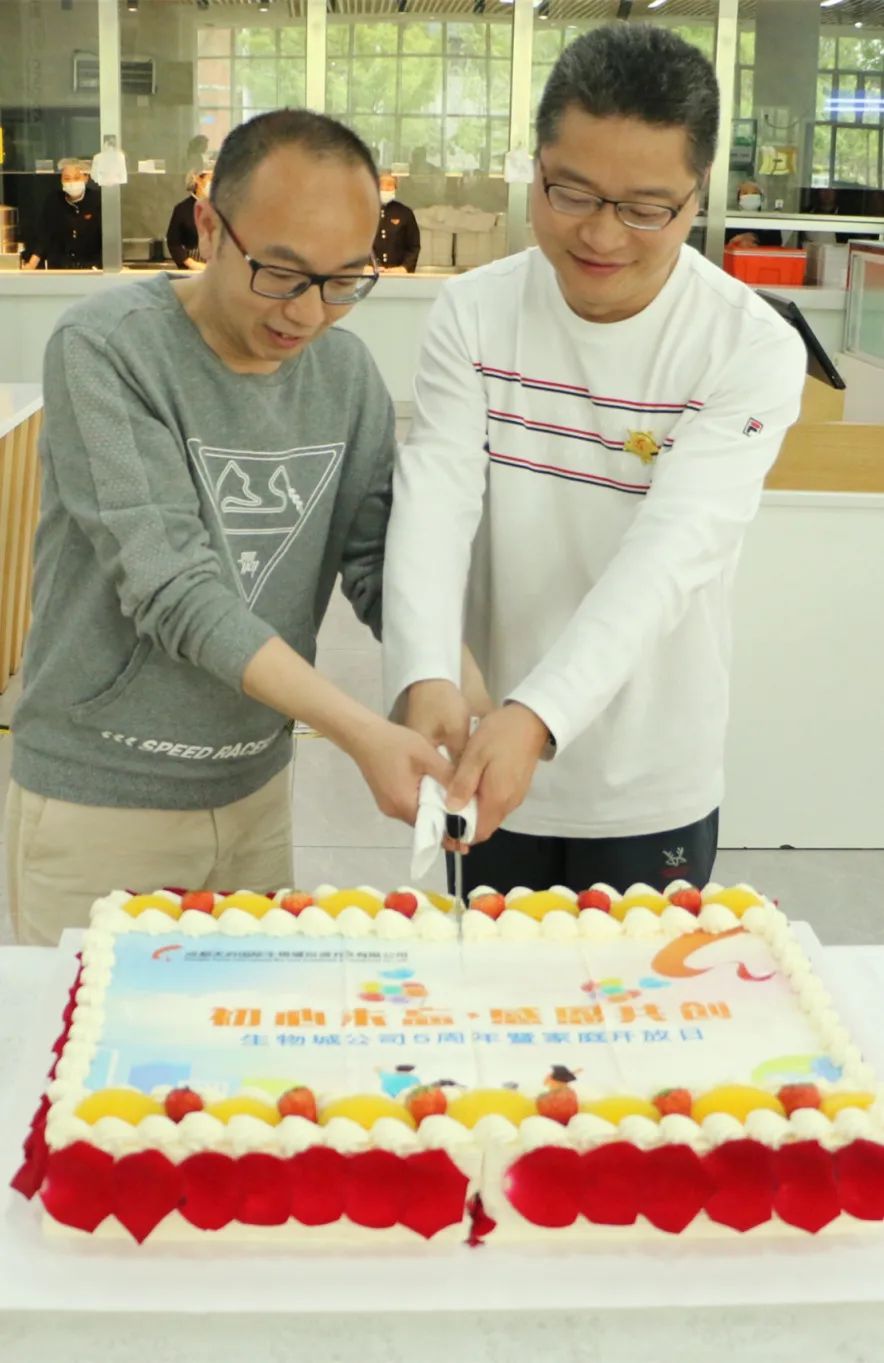 家庭共創(chuàng )游戲結束后,公司領(lǐng)導及全員一起切蛋糕、吹蠟燭,舉杯同慶生物城公司5周年生日快樂(lè )。