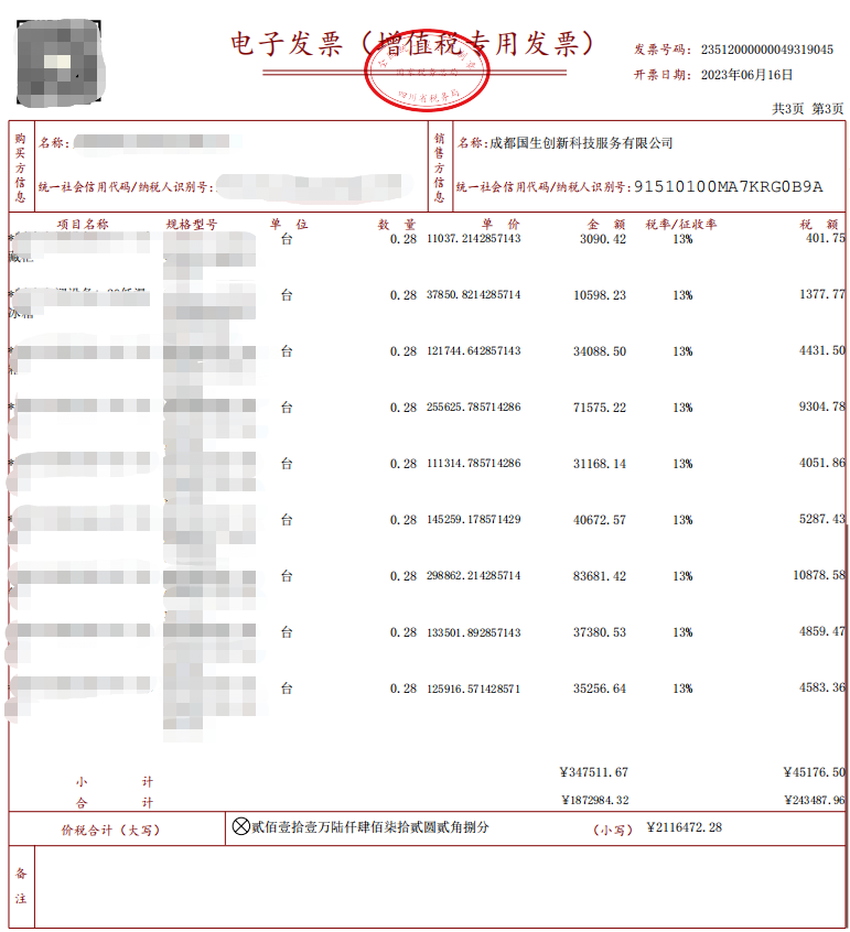 2023年6月,成都天府國際生物城發(fā)展集團有限公司下屬公司成都國生創(chuàng )新科技服務(wù)有限公司通過(guò)稅務(wù)管理系統,成功自動(dòng)開(kāi)具集團“首張”全電發(fā)票。